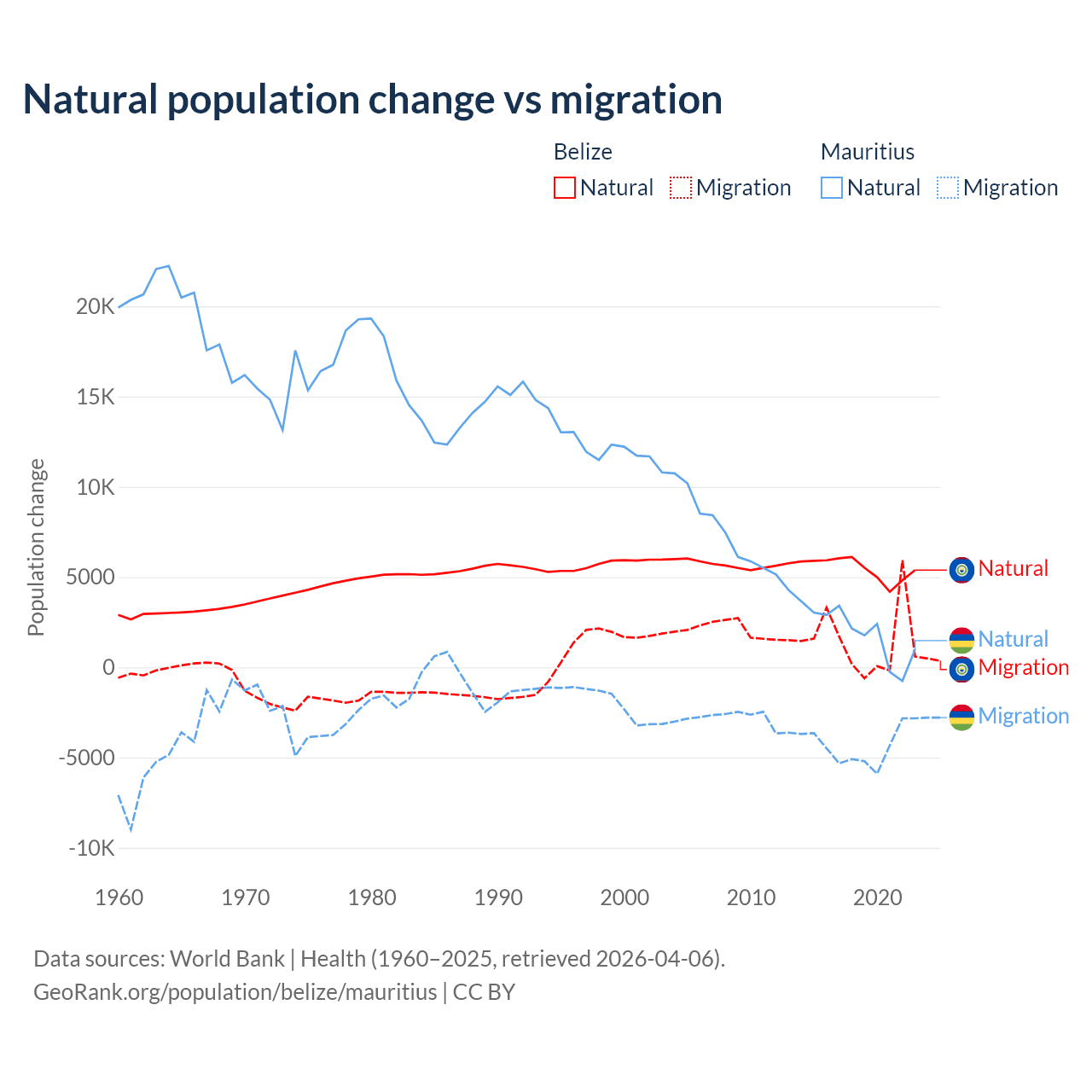Over the last 10 years, 79.6% of the population change in Belize is from natural causes (a gain of 54,754 people) and 20.4% is from migration (a gain of 14,073 people). In Mauritius 30.9% is from natural causes (a gain of 19,327 people) and 69.1% is from migration (a loss of 43,294 people).