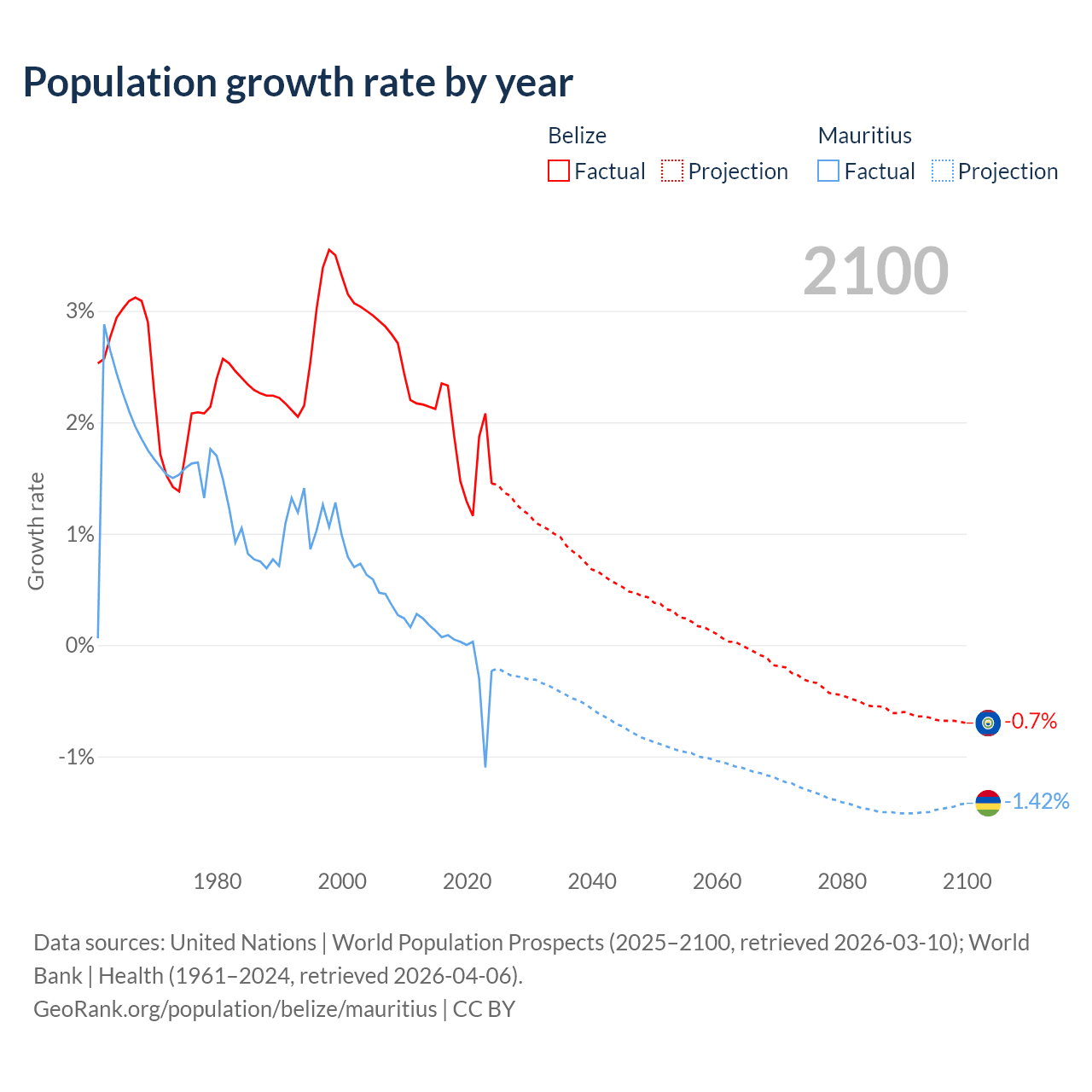 - For the last 10 years, Belize has had an average growth rate of +1.83% per year vs -0.09% in Mauritius.