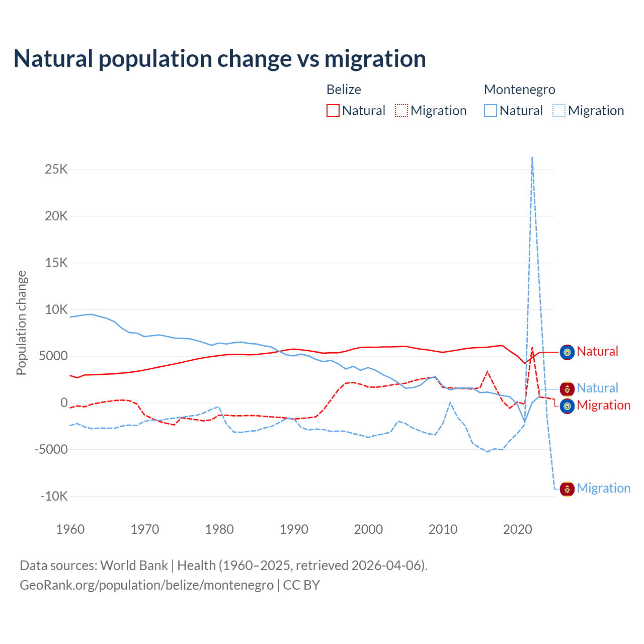 Over the last 10 years, 79.6% of the population change in Belize is from natural causes (a gain of 54,754 people) and 20.4% is from migration (a gain of 14,073 people). In Montenegro 52.4% is from natural causes (a gain of 4,501 people) and 47.6% is from migration (a gain of 4,095 people).
