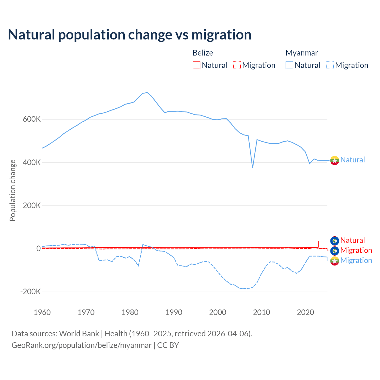Over the last 10 years, 79.6% of the population change in Belize is from natural causes (a gain of 54,754 people) and 20.4% is from migration (a gain of 14,073 people). In Myanmar 86% is from natural causes (a gain of 4,594,615 people) and 14% is from migration (a loss of 749,272 people).