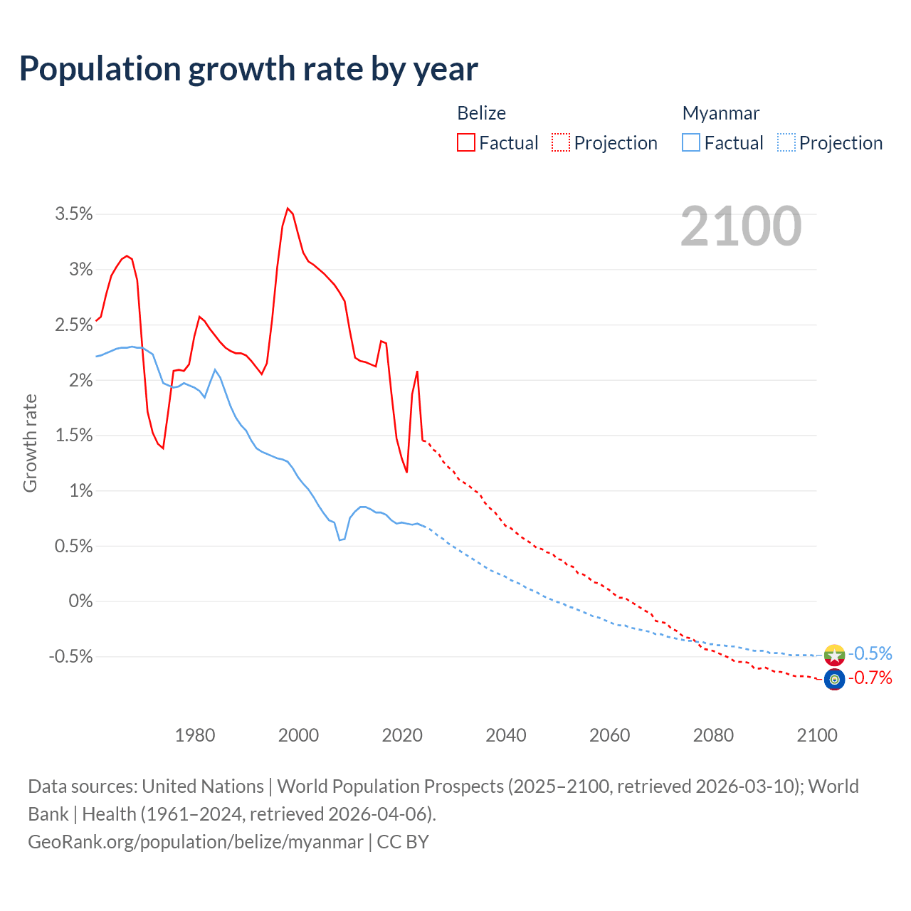 - For the last 10 years, Belize has had an average growth rate of +1.83% per year vs +0.74% in Myanmar.