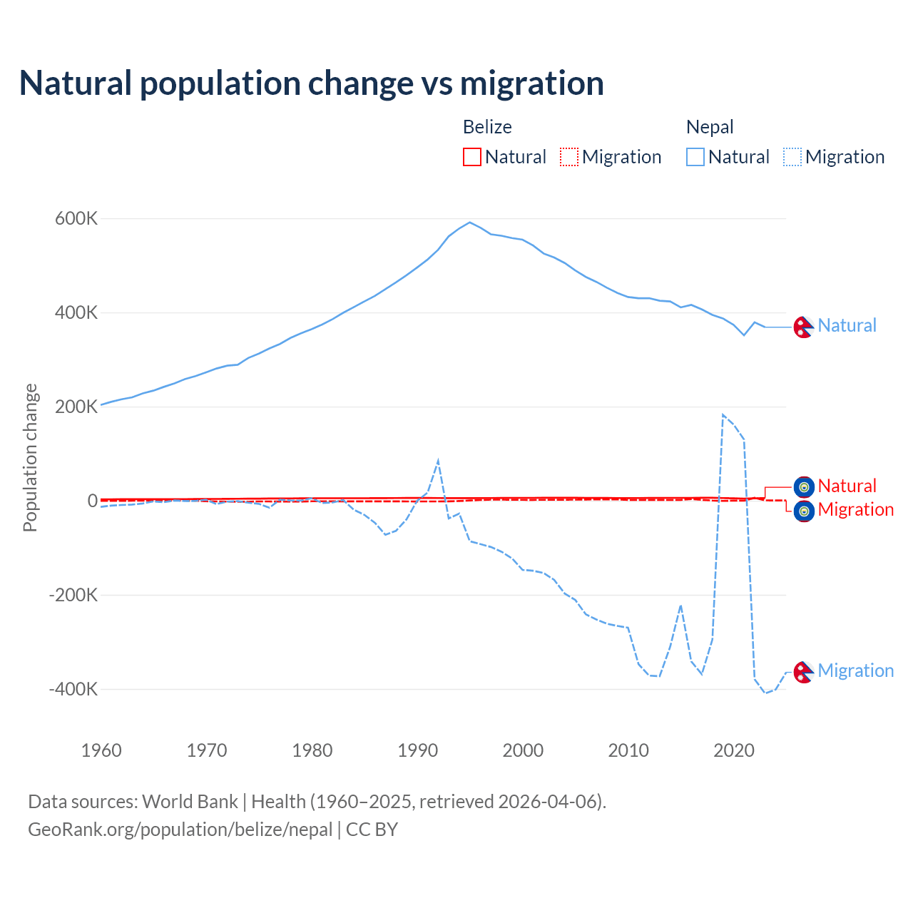 Over the last 10 years, 79.6% of the population change in Belize is from natural causes (a gain of 54,754 people) and 20.4% is from migration (a gain of 14,073 people). In Nepal 67.9% is from natural causes (a gain of 3,909,749 people) and 32.1% is from migration (a loss of 1,851,664 people).