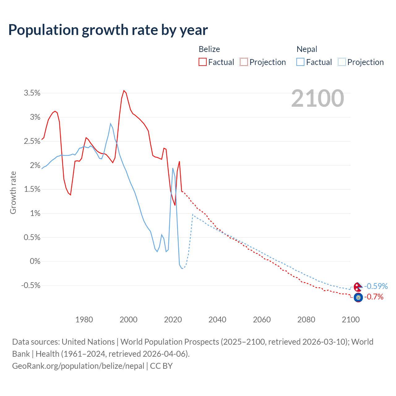 - For the last 10 years, Belize has had an average growth rate of +1.83% per year vs +0.66% in Nepal.