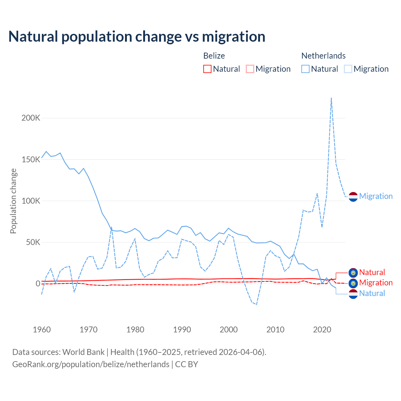 Over the last 10 years, 79.6% of the population change in Belize is from natural causes (a gain of 54,754 people) and 20.4% is from migration (a gain of 14,073 people). In the Netherlands 11.8% is from natural causes (a gain of 134,554 people) and 88.2% is from migration (a gain of 1,006,495 people).
