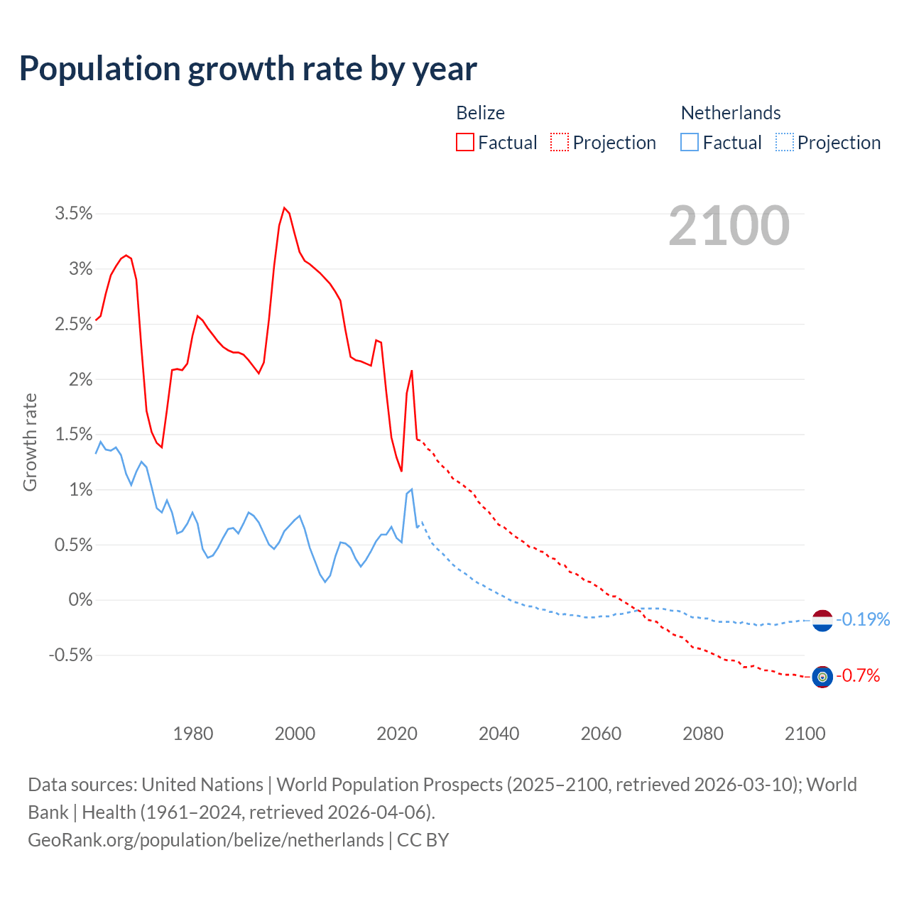 - For the last 10 years, Belize has had an average growth rate of +1.83% per year vs +0.62% in the Netherlands.