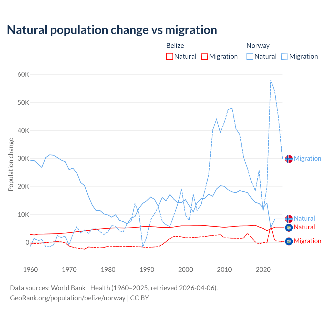 Over the last 10 years, 79.6% of the population change in Belize is from natural causes (a gain of 54,754 people) and 20.4% is from migration (a gain of 14,073 people). In Norway 31.3% is from natural causes (a gain of 138,699 people) and 68.7% is from migration (a gain of 303,945 people).