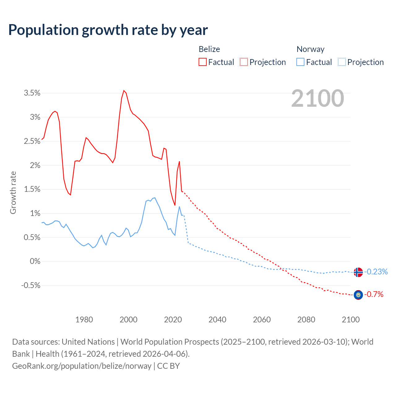 - For the last 10 years, Belize has had an average growth rate of +1.83% per year vs +0.85% in Norway.