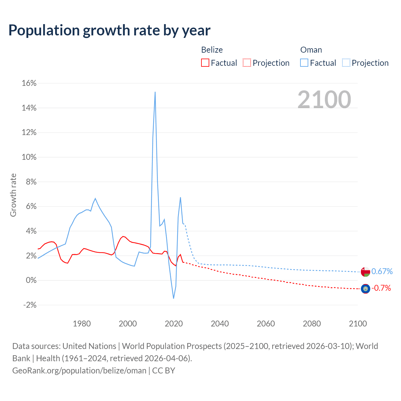 - For the last 10 years, Belize has had an average growth rate of +1.83% per year vs +2.99% in Oman.
