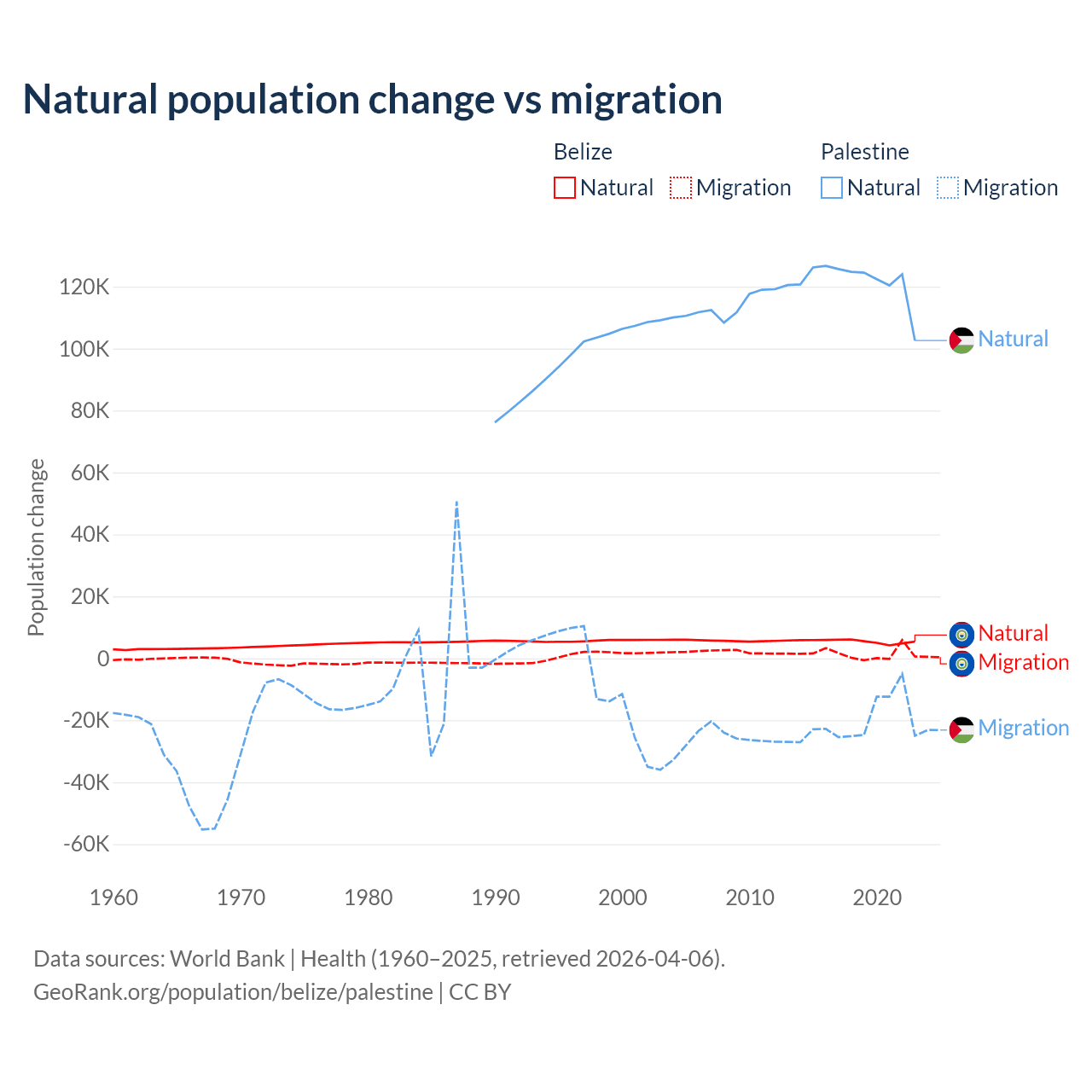 Over the last 10 years, 79.6% of the population change in Belize is from natural causes (a gain of 54,754 people) and 20.4% is from migration (a gain of 14,073 people). In Palestine 85.7% is from natural causes (a gain of 1,218,010 people) and 14.3% is from migration (a loss of 202,820 people).