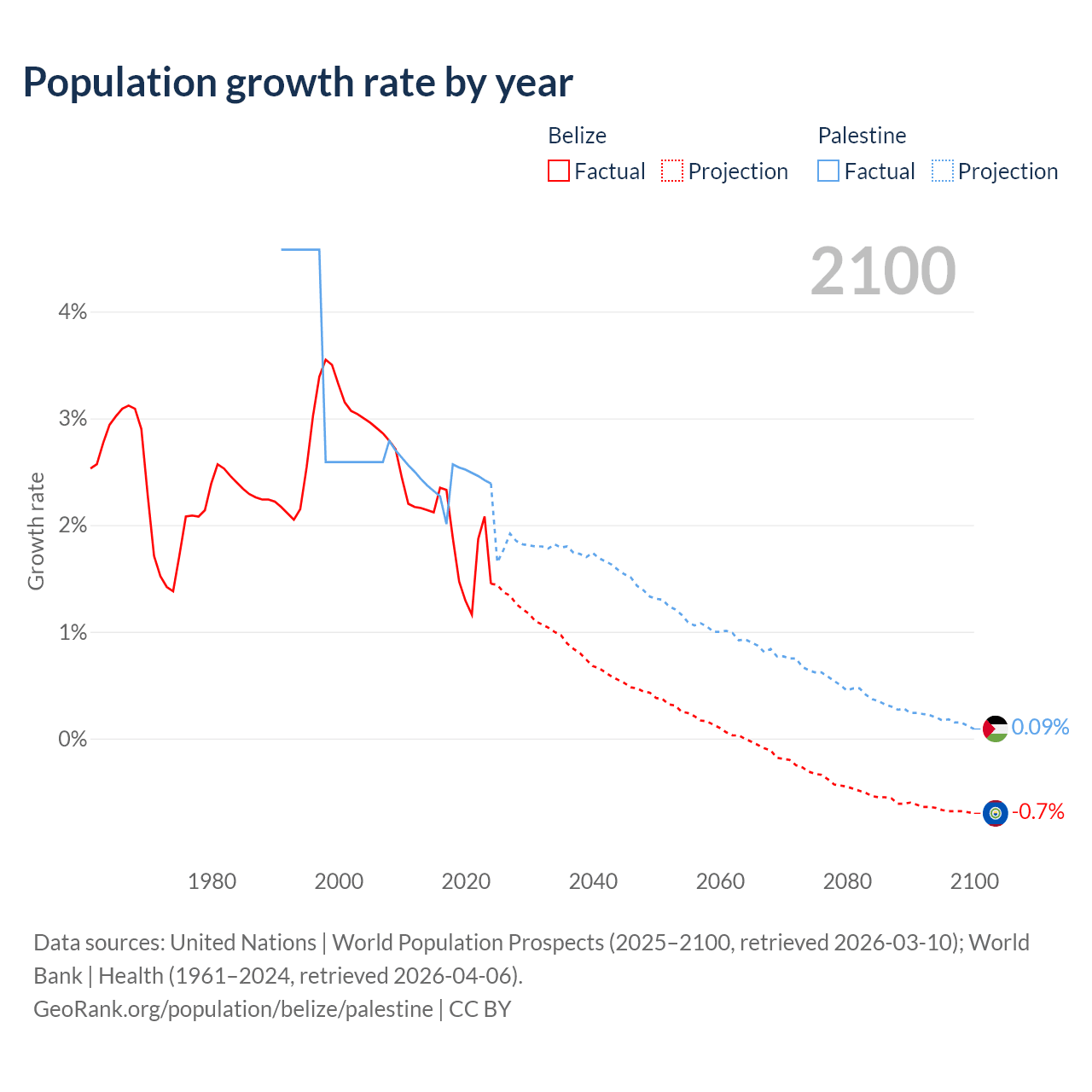 - For the last 10 years, Belize has had an average growth rate of +1.83% per year vs +2.4% in Palestine.