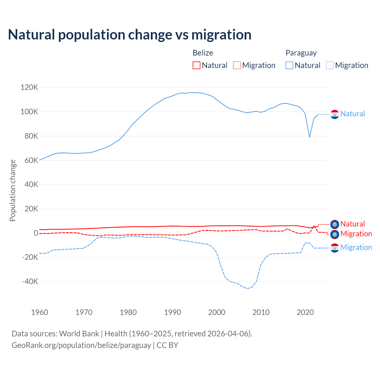 Over the last 10 years, 79.6% of the population change in Belize is from natural causes (a gain of 54,754 people) and 20.4% is from migration (a gain of 14,073 people). In Paraguay 87.6% is from natural causes (a gain of 1,002,636 people) and 12.4% is from migration (a loss of 141,377 people).