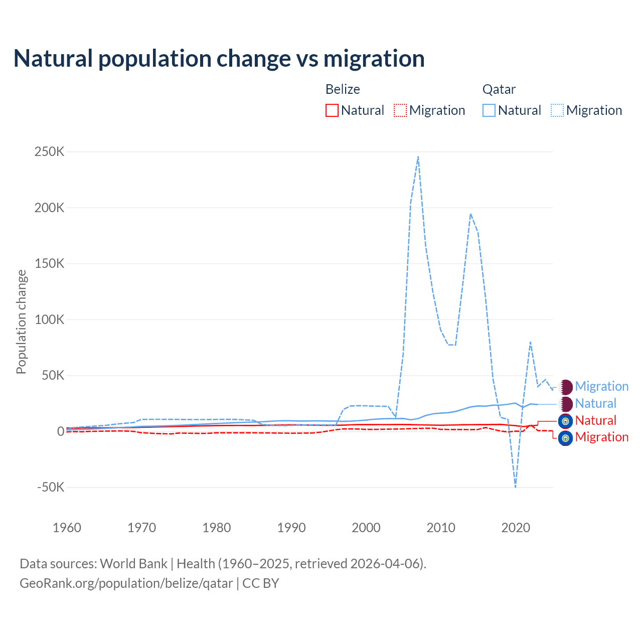Over the last 10 years, 79.6% of the population change in Belize is from natural causes (a gain of 54,754 people) and 20.4% is from migration (a gain of 14,073 people). In Qatar 26.1% is from natural causes (a gain of 232,009 people) and 73.9% is from migration (a gain of 655,712 people).