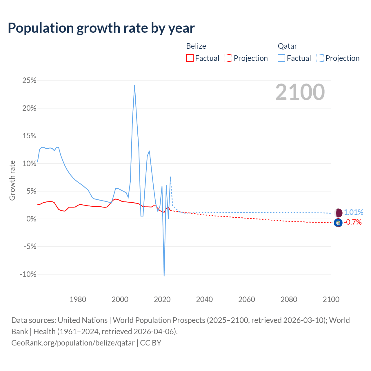 - For the last 10 years, Belize has had an average growth rate of +1.83% per year vs +3.86% in Qatar.