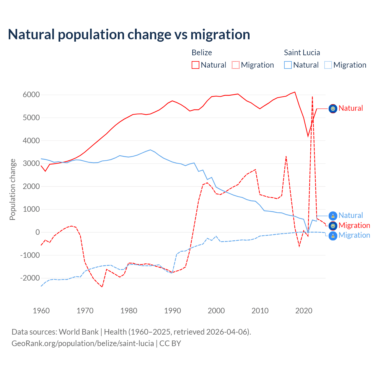Over the last 10 years, 79.6% of the population change in Belize is from natural causes (a gain of 54,754 people) and 20.4% is from migration (a gain of 14,073 people). In Saint Lucia 95.7% is from natural causes (a gain of 6,039 people) and 4.31% is from migration (a loss of 272 people).