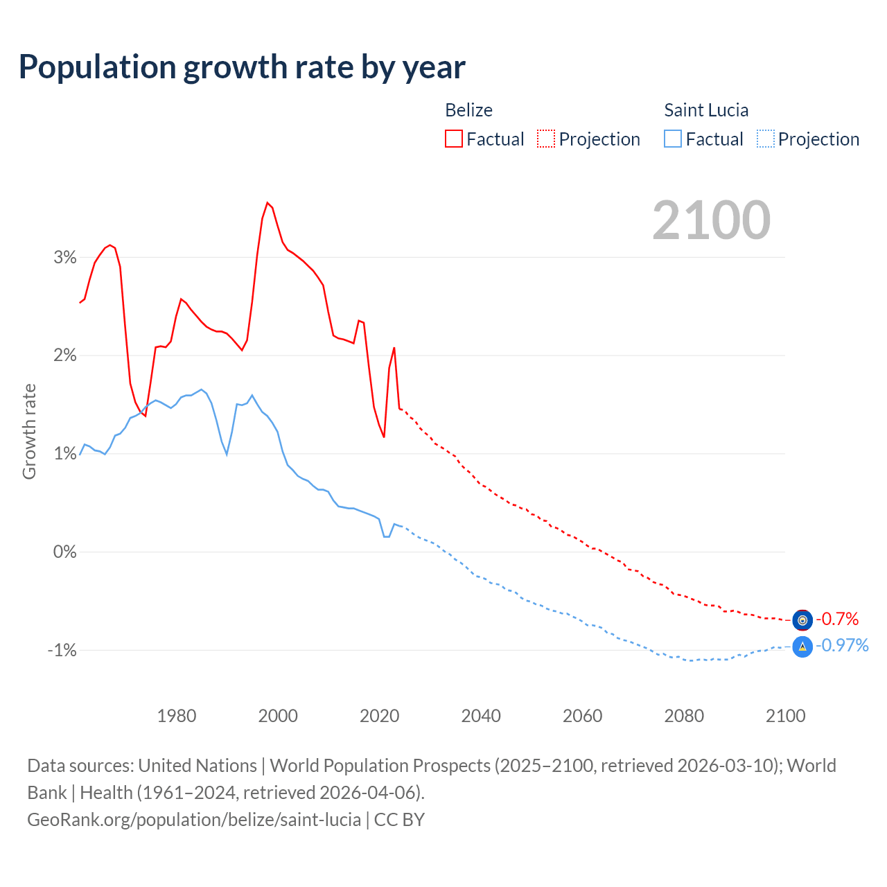 - For the last 10 years, Belize has had an average growth rate of +1.83% per year vs +0.33% in Saint Lucia.