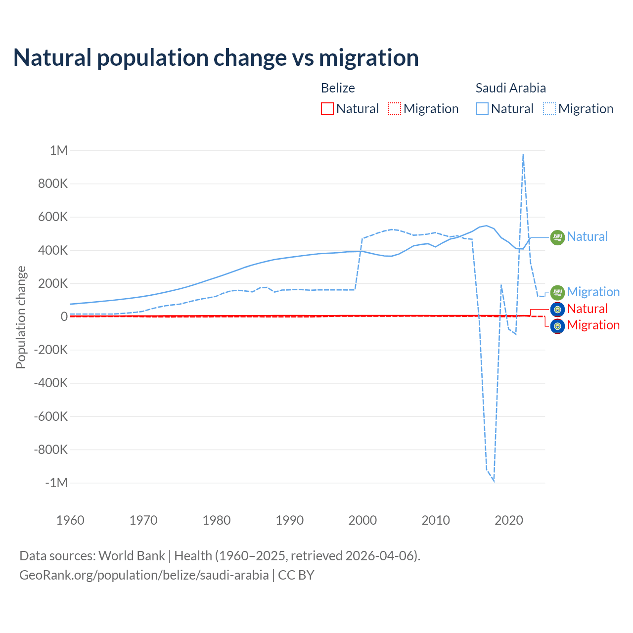 Over the last 10 years, 79.6% of the population change in Belize is from natural causes (a gain of 54,754 people) and 20.4% is from migration (a gain of 14,073 people). In Saudi Arabia 93.9% is from natural causes (a gain of 4,829,562 people) and 6.05% is from migration (a gain of 311,209 people).