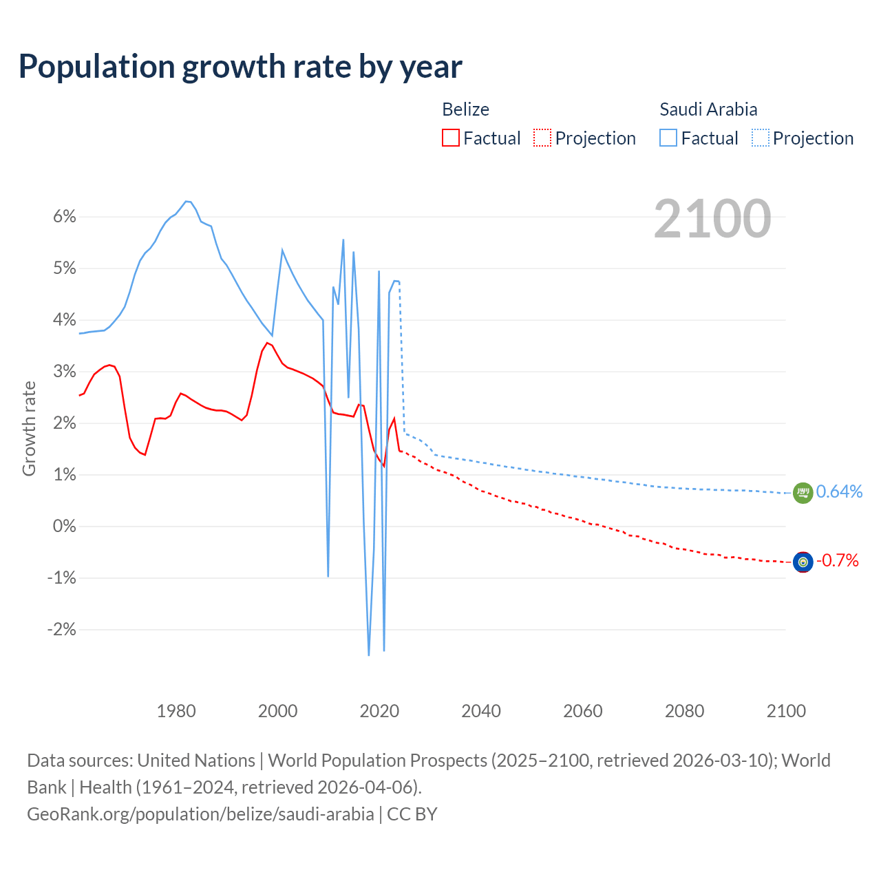 - For the last 10 years, Belize has had an average growth rate of +1.83% per year vs +2.3% in Saudi Arabia.