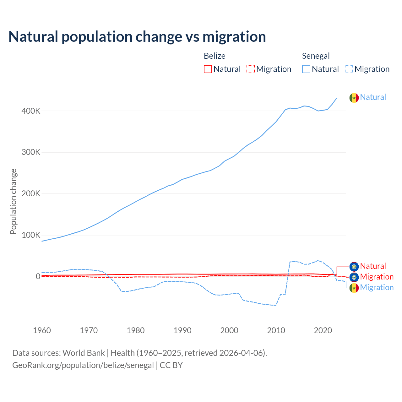 Over the last 10 years, 79.6% of the population change in Belize is from natural causes (a gain of 54,754 people) and 20.4% is from migration (a gain of 14,073 people). In Senegal 93.9% is from natural causes (a gain of 4,089,205 people) and 6.13% is from migration (a gain of 267,266 people).