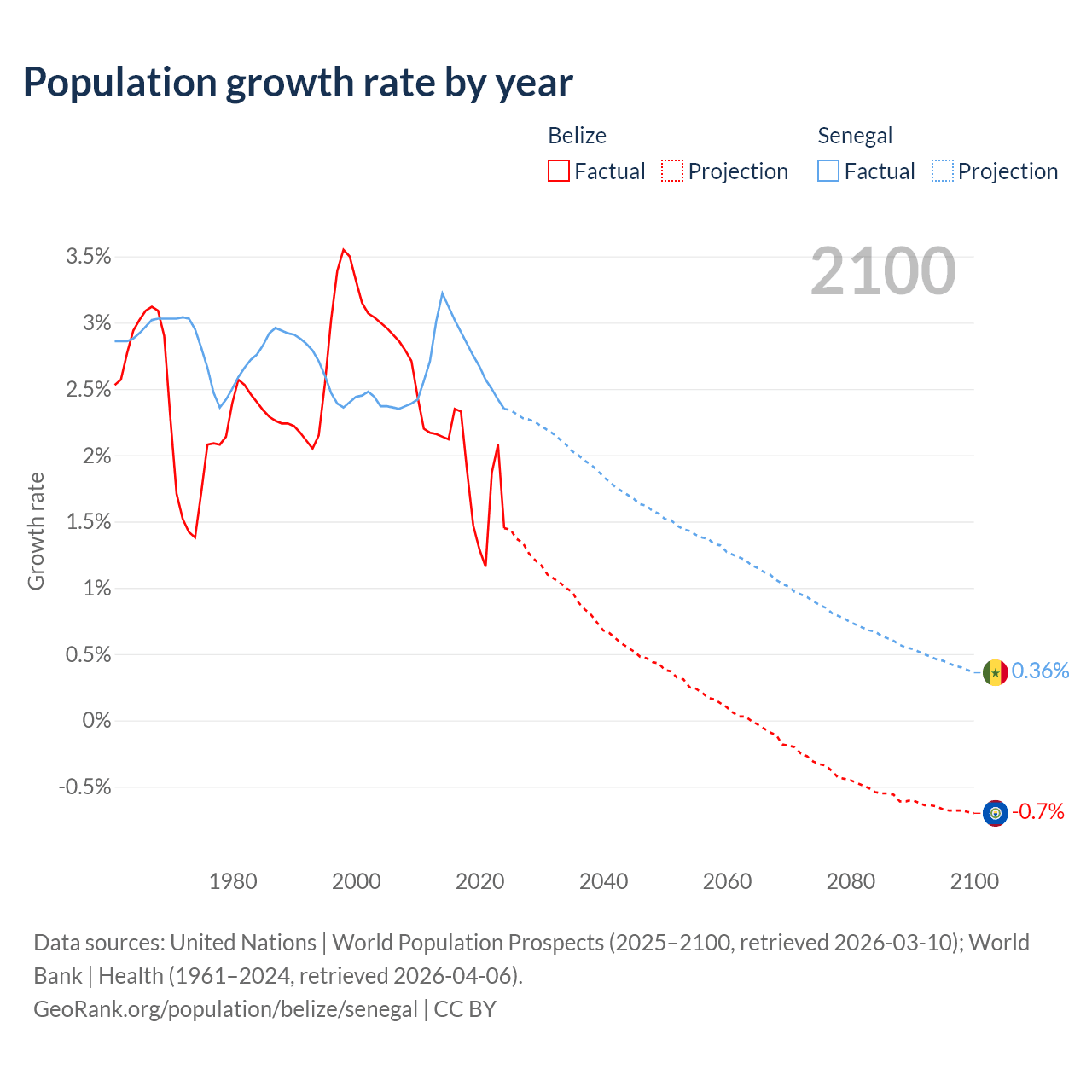 - For the last 10 years, Belize has had an average growth rate of +1.83% per year vs +2.76% in Senegal.