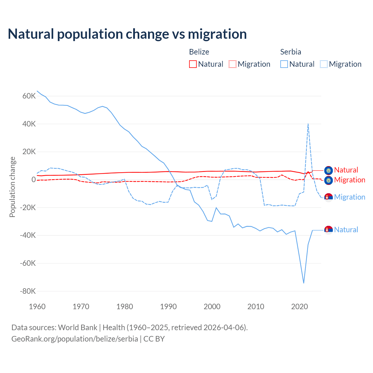 Over the last 10 years, 79.6% of the population change in Belize is from natural causes (a gain of 54,754 people) and 20.4% is from migration (a gain of 14,073 people). In Serbia 83.3% is from natural causes (a loss of 435,148 people) and 16.7% is from migration (a loss of 87,110 people).