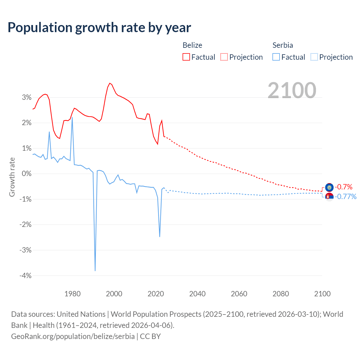 - For the last 10 years, Belize has had an average growth rate of +1.83% per year vs -0.76% in Serbia.