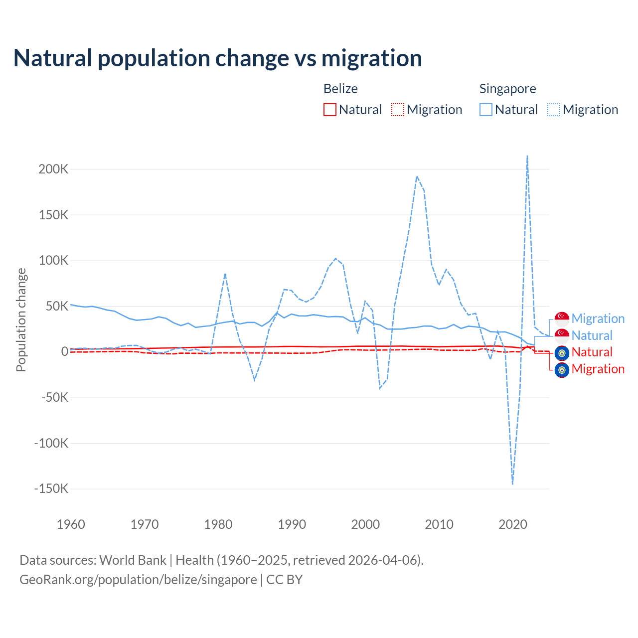 Over the last 10 years, 79.6% of the population change in Belize is from natural causes (a gain of 54,754 people) and 20.4% is from migration (a gain of 14,073 people). In Singapore 54.8% is from natural causes (a gain of 195,953 people) and 45.2% is from migration (a gain of 161,805 people).
