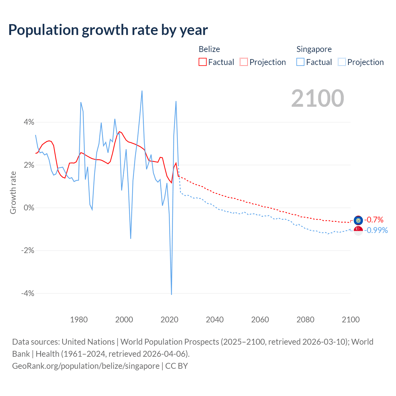 - For the last 10 years, Belize has had an average growth rate of +1.83% per year vs +1.04% in Singapore.