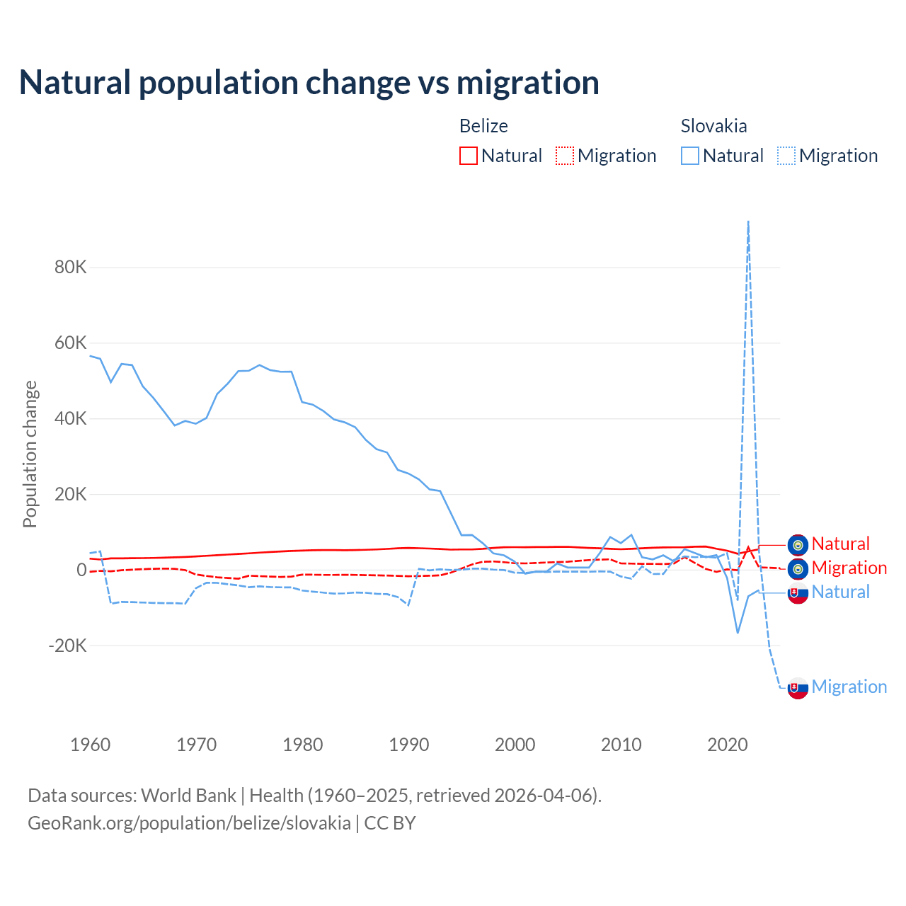 Over the last 10 years, 79.6% of the population change in Belize is from natural causes (a gain of 54,754 people) and 20.4% is from migration (a gain of 14,073 people). In Slovakia 7.47% is from natural causes (a loss of 8,728 people) and 92.5% is from migration (a gain of 108,156 people).