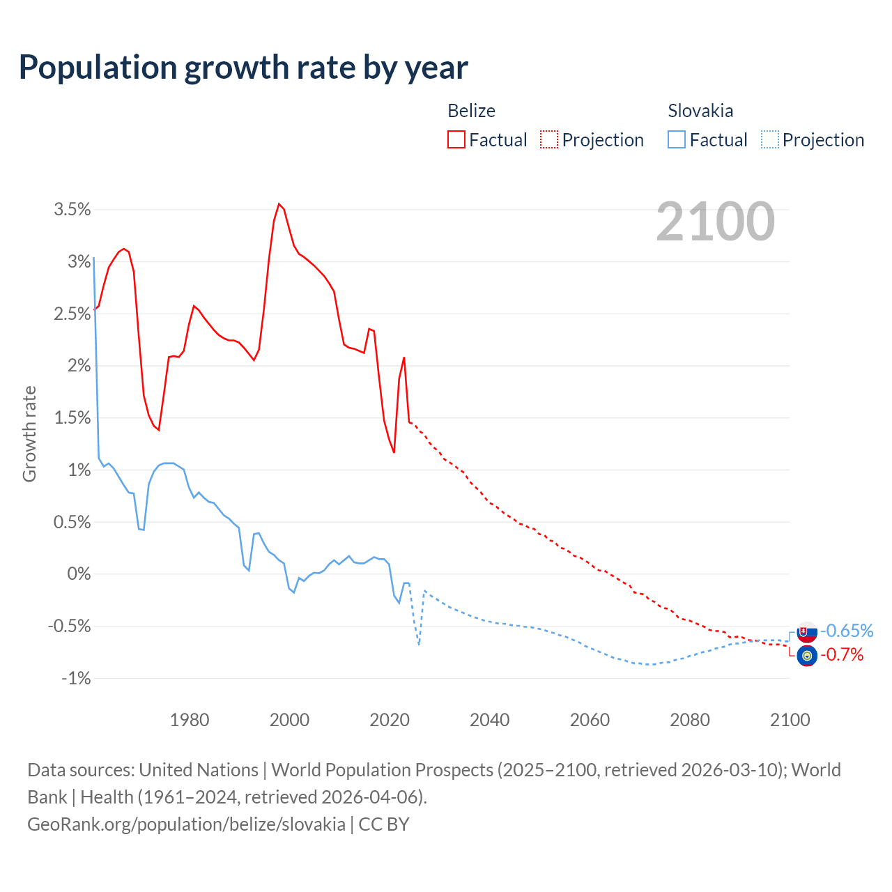 - For the last 10 years, Belize has had an average growth rate of +1.83% per year vs +0.01% in Slovakia.
