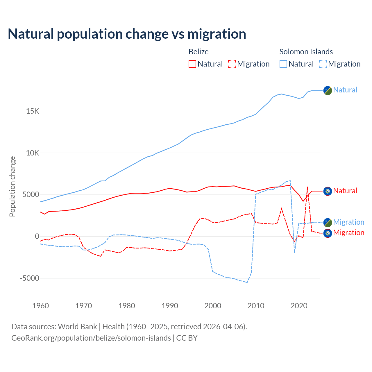 Over the last 10 years, 79.6% of the population change in Belize is from natural causes (a gain of 54,754 people) and 20.4% is from migration (a gain of 14,073 people). In the Solomon Islands 82.8% is from natural causes (a gain of 168,727 people) and 17.2% is from migration (a gain of 35,031 people).