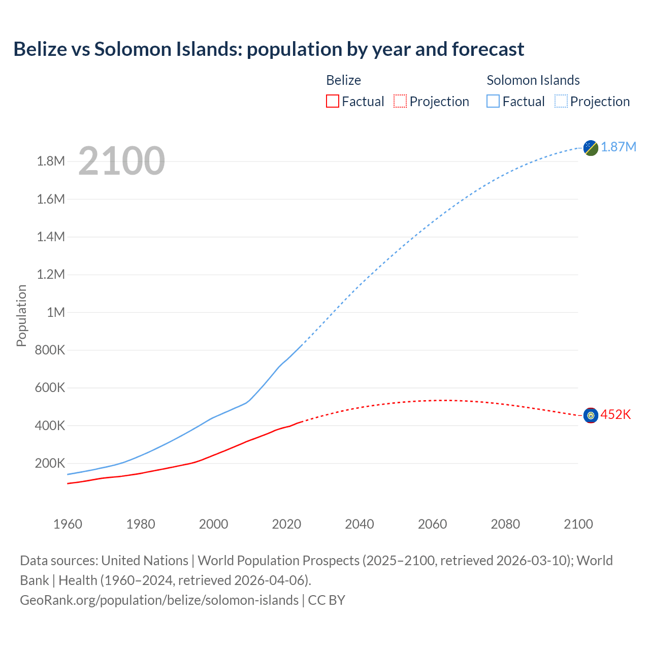 Belize vs Solomon Islands: population by year and forecast
