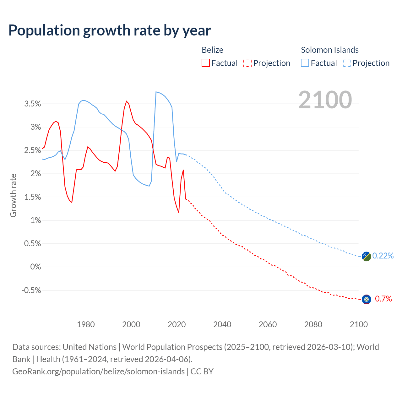 - For the last 10 years, Belize has had an average growth rate of +1.83% per year vs +2.95% in the Solomon Islands.