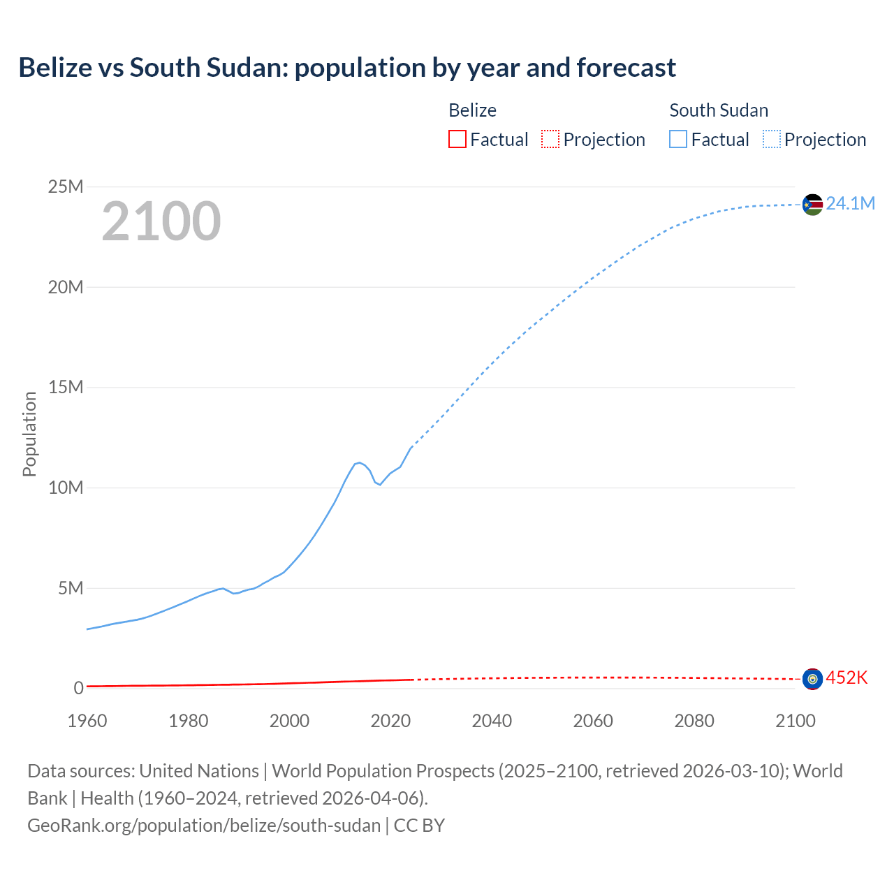 - South Sudan's population is 29.1 times bigger than Belize's.