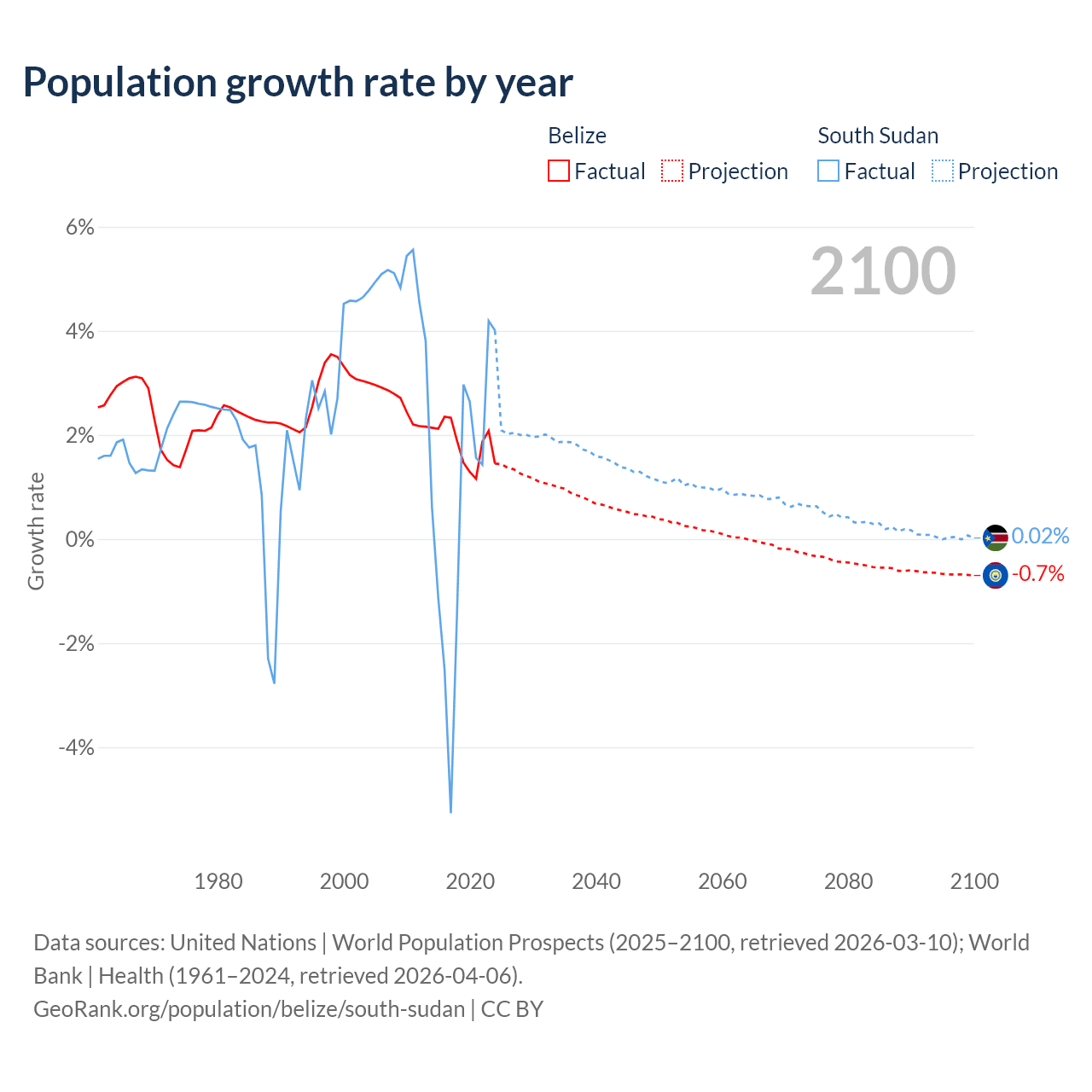 - For the last 10 years, Belize has had an average growth rate of +1.83% per year vs +0.65% in South Sudan.