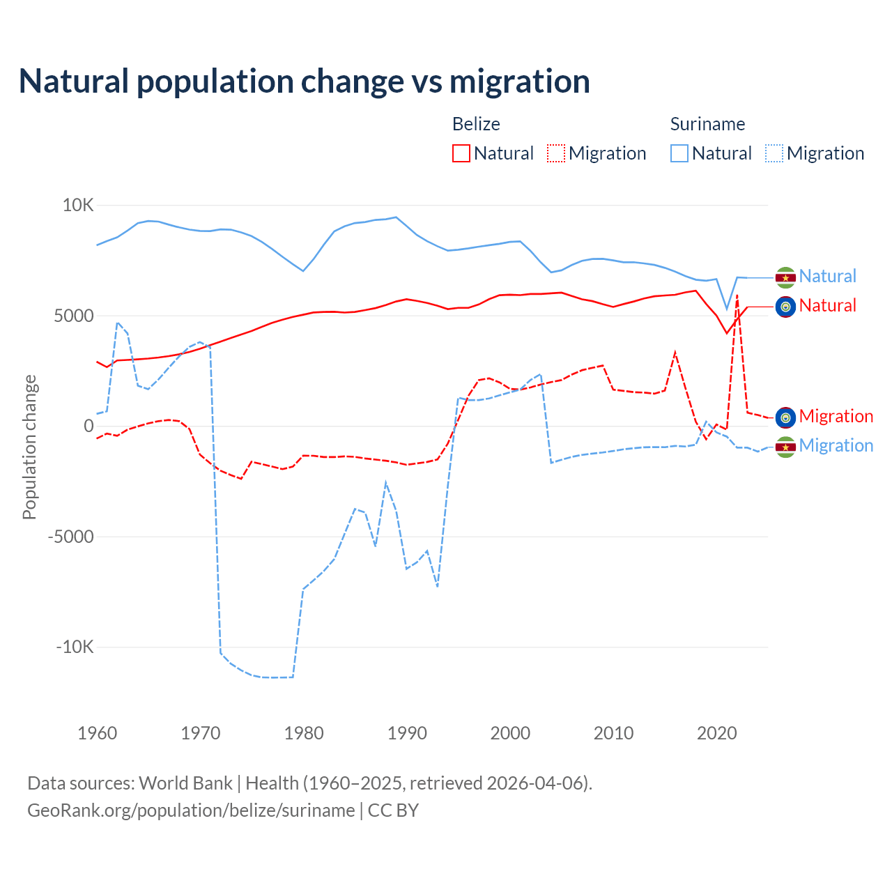 Over the last 10 years, 79.6% of the population change in Belize is from natural causes (a gain of 54,754 people) and 20.4% is from migration (a gain of 14,073 people). In Suriname 90.3% is from natural causes (a gain of 66,709 people) and 9.72% is from migration (a loss of 7,185 people).