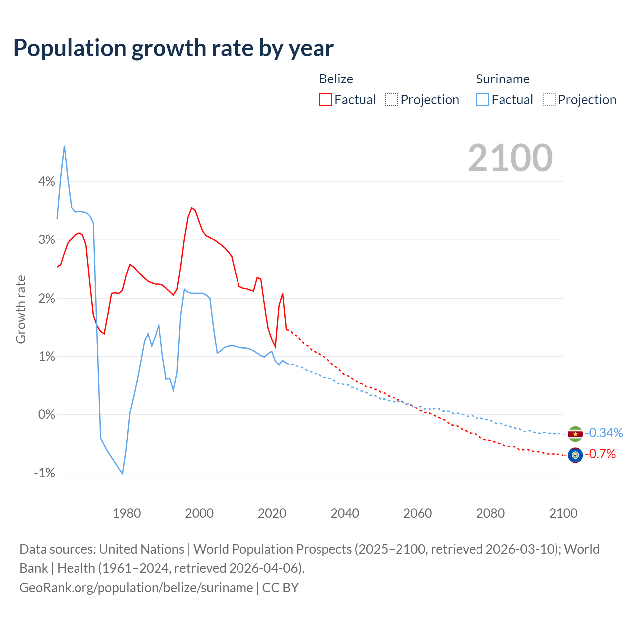 - For the last 10 years, Belize has had an average growth rate of +1.83% per year vs +0.99% in Suriname.