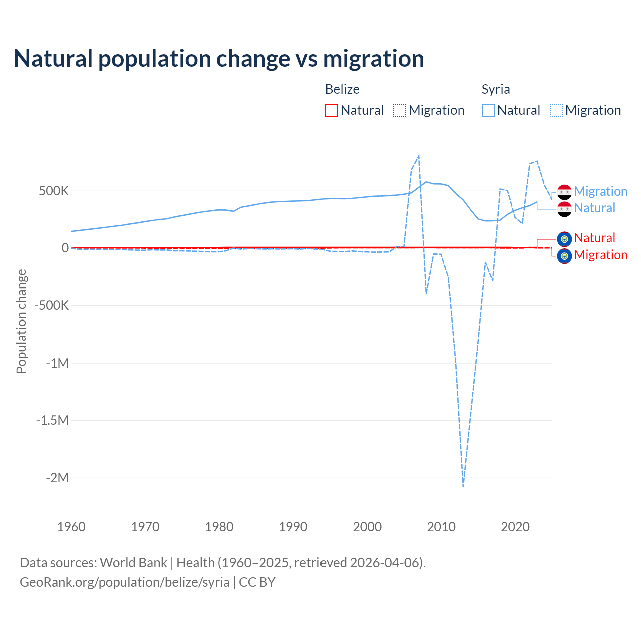 Over the last 10 years, 79.6% of the population change in Belize is from natural causes (a gain of 54,754 people) and 20.4% is from migration (a gain of 14,073 people). In Syria 91.3% is from natural causes (a gain of 3,047,621 people) and 8.72% is from migration (a gain of 291,069 people).