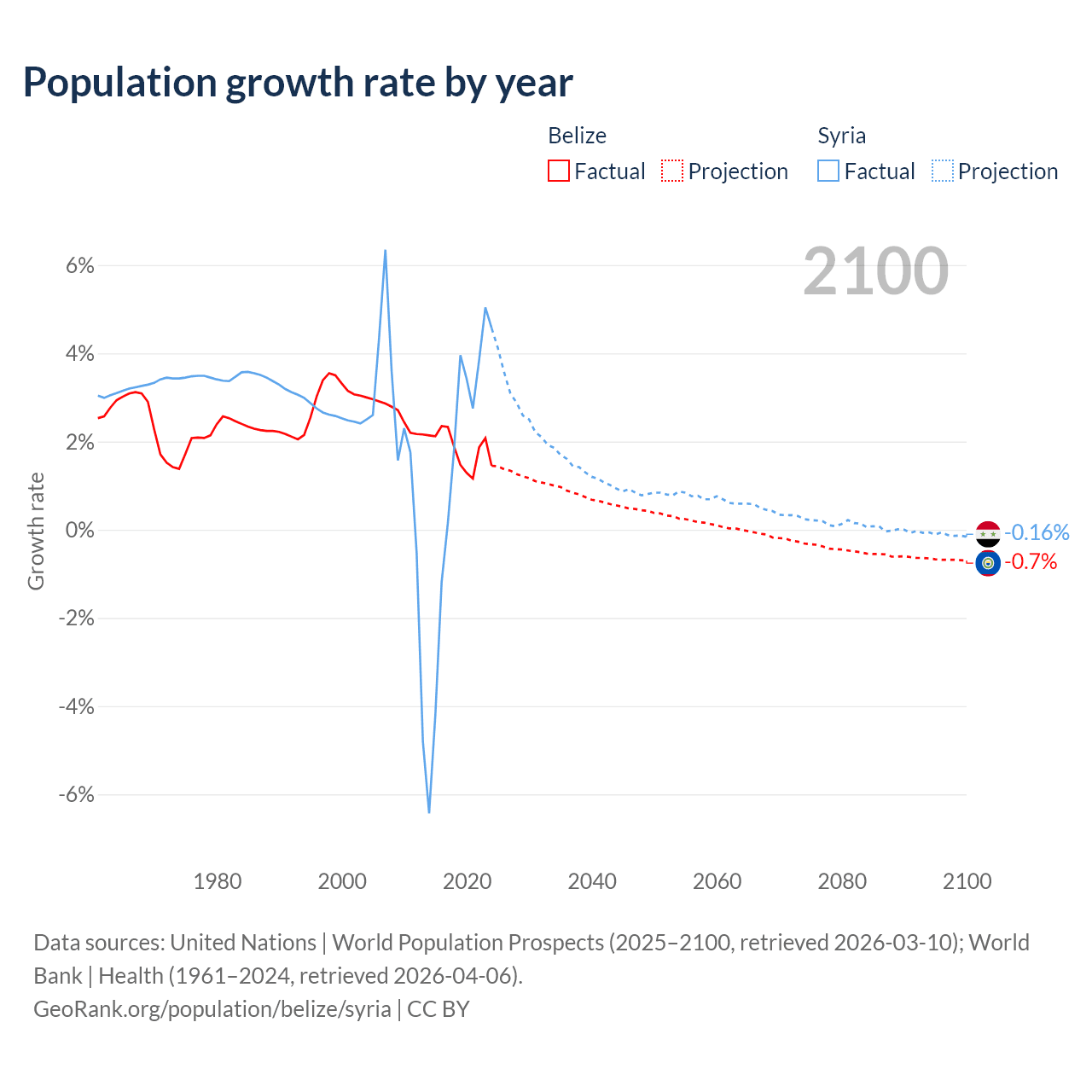- For the last 10 years, Belize has had an average growth rate of +1.83% per year vs +1.25% in Syria.