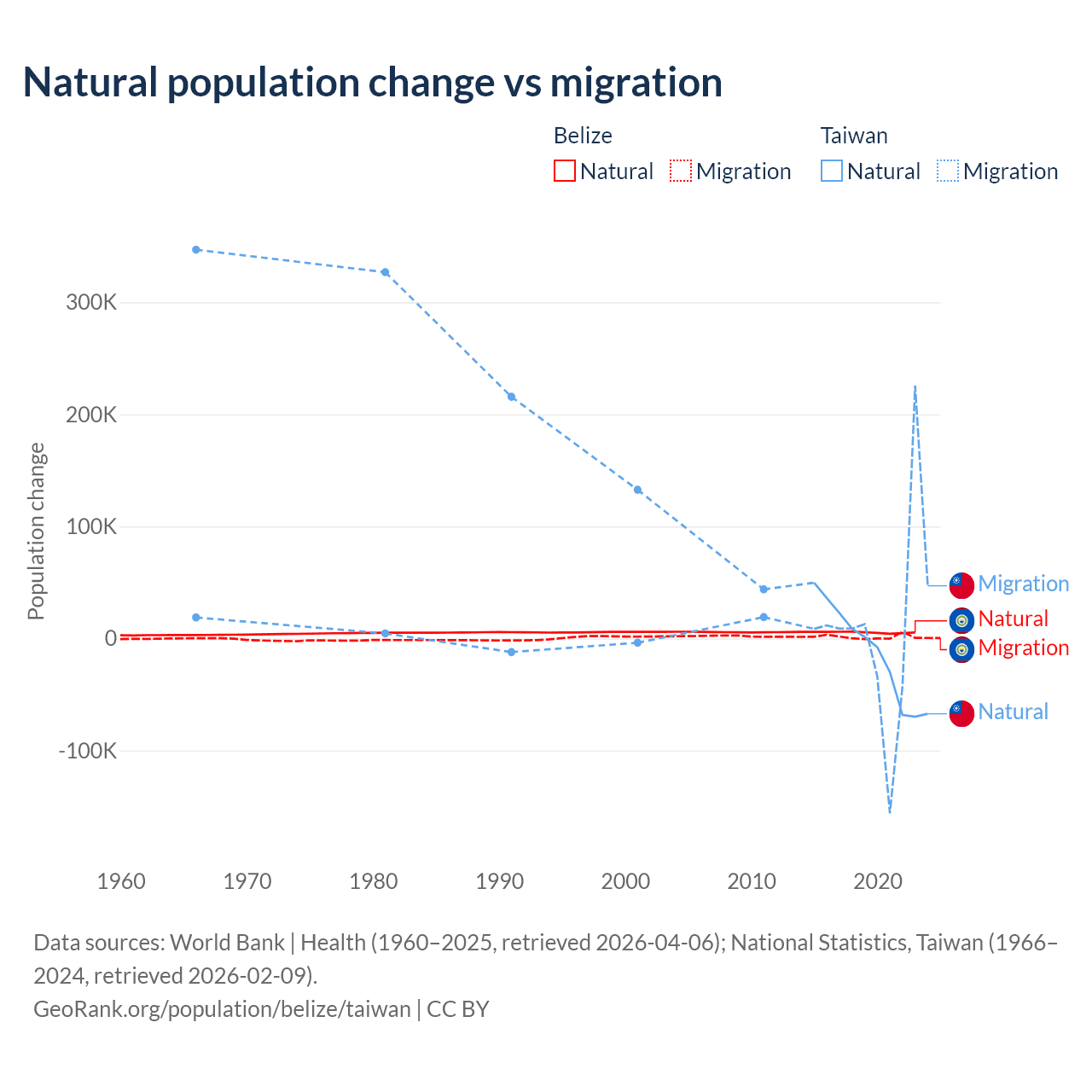 Over the last 10 years, 79.6% of the population change in Belize is from natural causes (a gain of 54,754 people) and 20.4% is from migration (a gain of 14,073 people). In Taiwan 56.7% is from natural causes (a loss of 57,467 people) and 43.3% is from migration (a gain of 43,884 people).