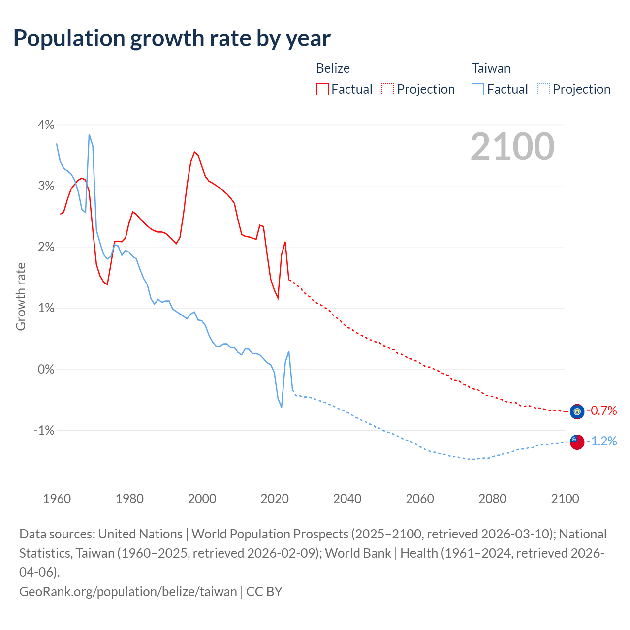 - For the last 10 years, Belize has had an average growth rate of +1.83% per year vs -0.03% in Taiwan.