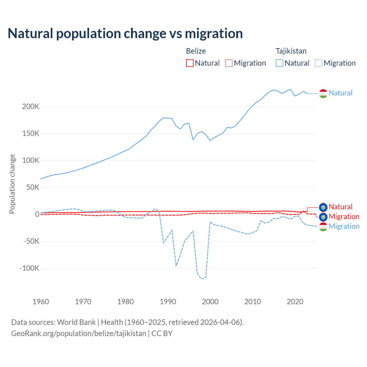 Over the last 10 years, 79.6% of the population change in Belize is from natural causes (a gain of 54,754 people) and 20.4% is from migration (a gain of 14,073 people). In Tajikistan 96% is from natural causes (a gain of 2,266,045 people) and 3.95% is from migration (a loss of 93,205 people).