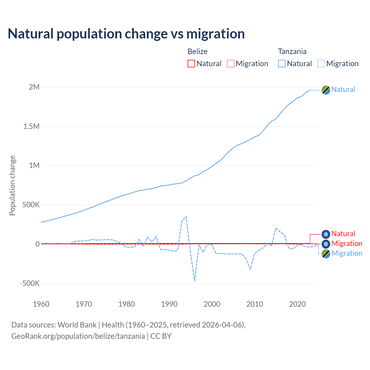 Over the last 10 years, 79.6% of the population change in Belize is from natural causes (a gain of 54,754 people) and 20.4% is from migration (a gain of 14,073 people). In Tanzania 98.7% is from natural causes (a gain of 17,769,541 people) and 1.27% is from migration (a gain of 229,466 people).