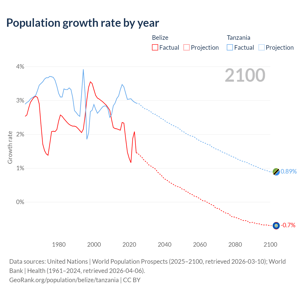 - For the last 10 years, Belize has had an average growth rate of +1.83% per year vs +3.13% in Tanzania.