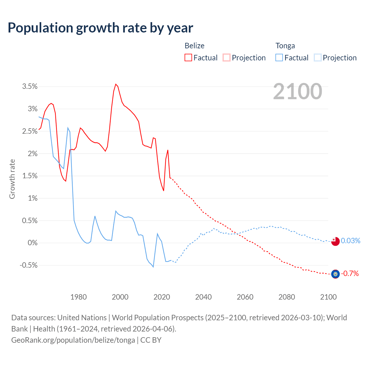 - For the last 10 years, Belize has had an average growth rate of +1.83% per year vs -0.25% in Tonga.