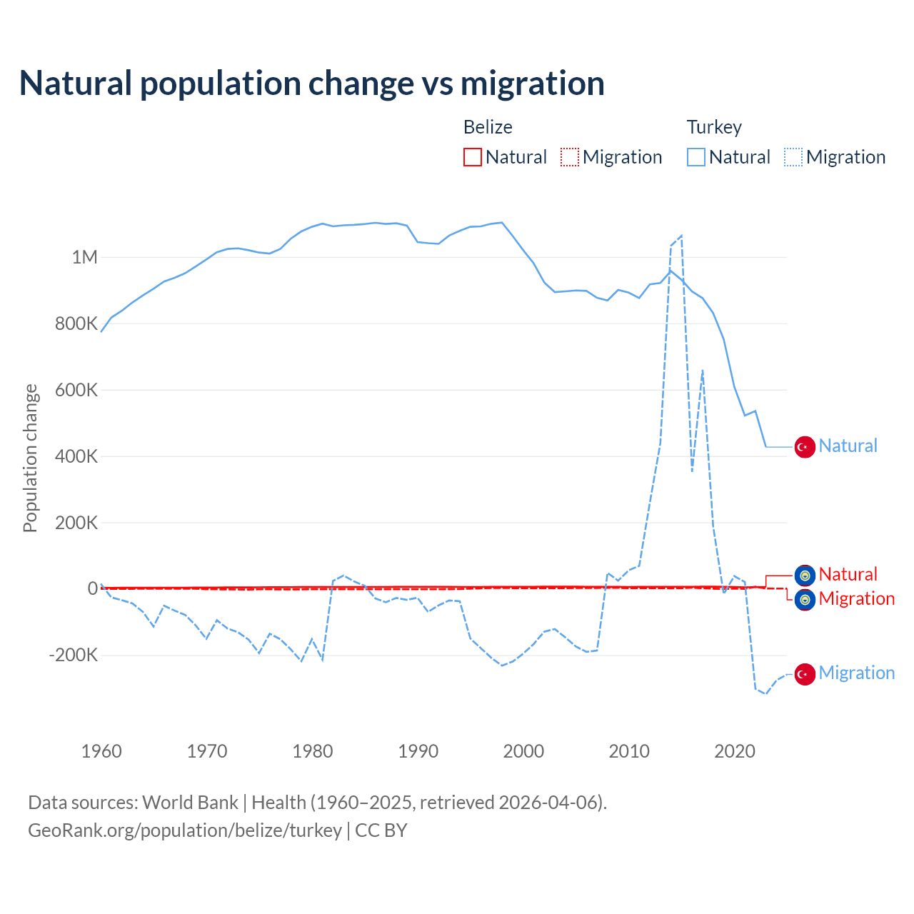 Over the last 10 years, 79.6% of the population change in Belize is from natural causes (a gain of 54,754 people) and 20.4% is from migration (a gain of 14,073 people). In Turkey 73% is from natural causes (a gain of 7,333,352 people) and 27% is from migration (a gain of 2,718,916 people).