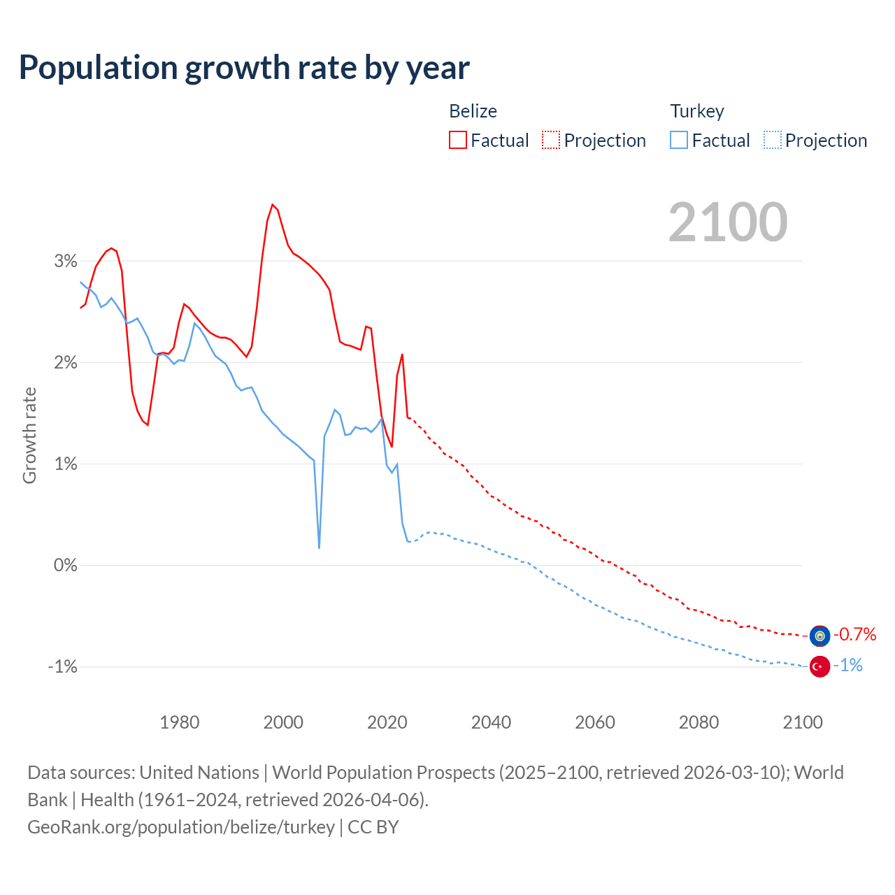 - For the last 10 years, Belize has had an average growth rate of +1.83% per year vs +1.06% in Turkey.