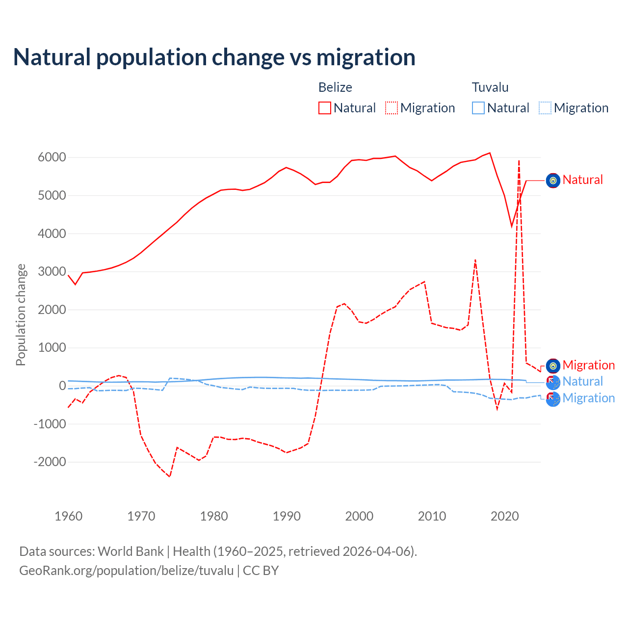 Over the last 10 years, 79.6% of the population change in Belize is from natural causes (a gain of 54,754 people) and 20.4% is from migration (a gain of 14,073 people). In Tuvalu 35.5% is from natural causes (a gain of 1,556 people) and 64.5% is from migration (a loss of 2,827 people).