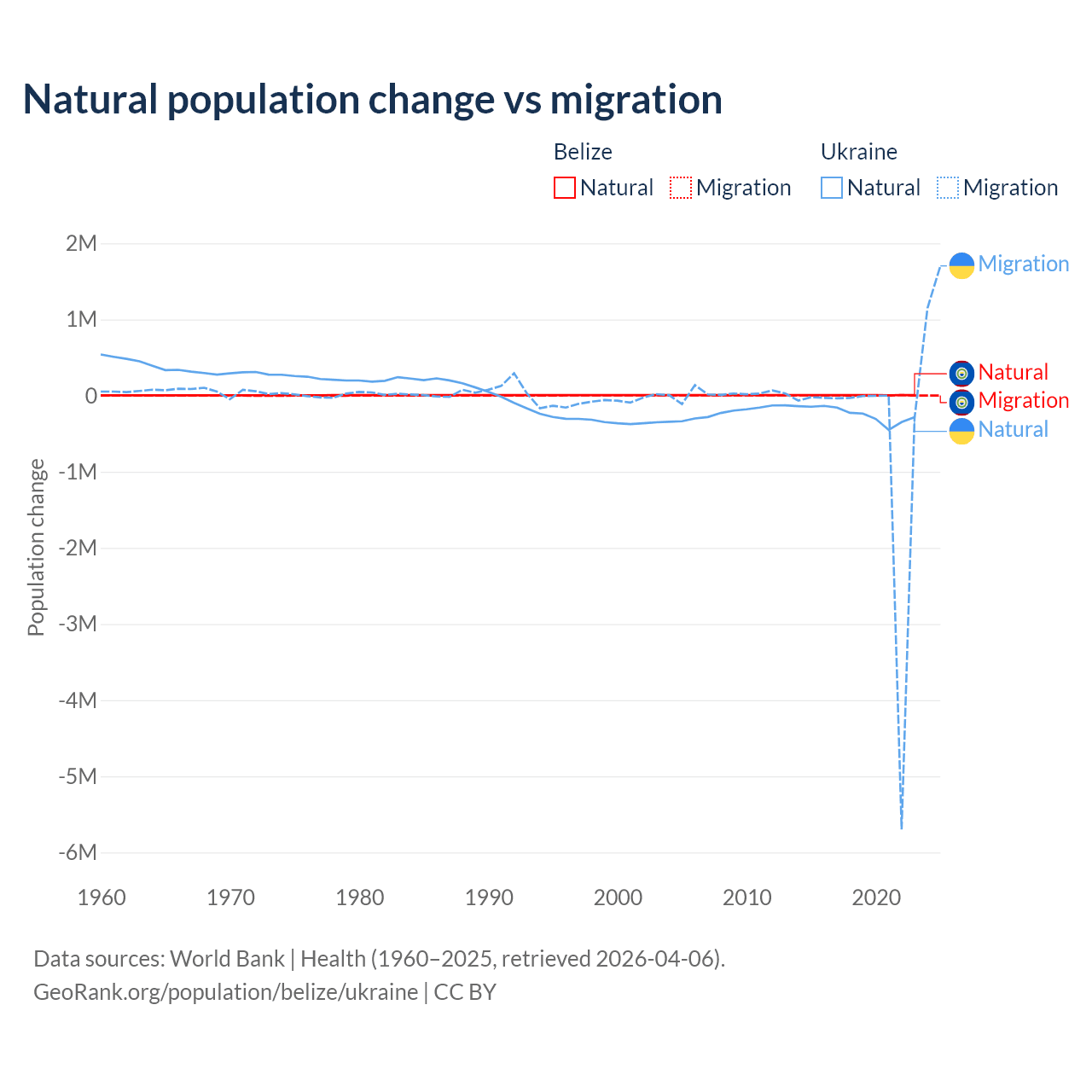 Over the last 10 years, 79.6% of the population change in Belize is from natural causes (a gain of 54,754 people) and 20.4% is from migration (a gain of 14,073 people). In Ukraine 28.2% is from natural causes (a loss of 2,435,153 people) and 71.8% is from migration (a loss of 6,198,995 people).