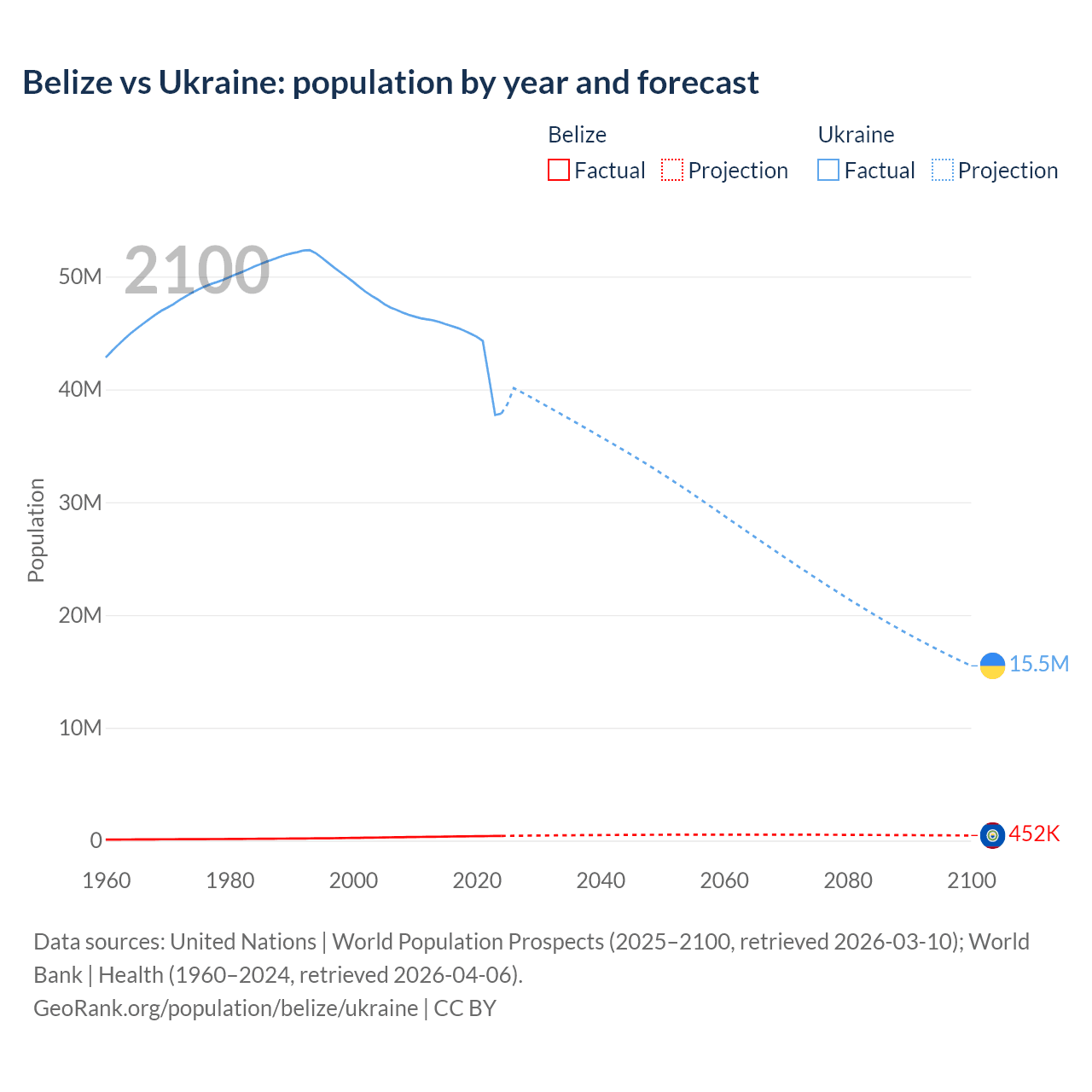 - Since 2006, the population of Belize has increased from 288K people to 430K (49.5% growth), while Ukraine has declined from 47.3M to 40.1M (15.1% decline).