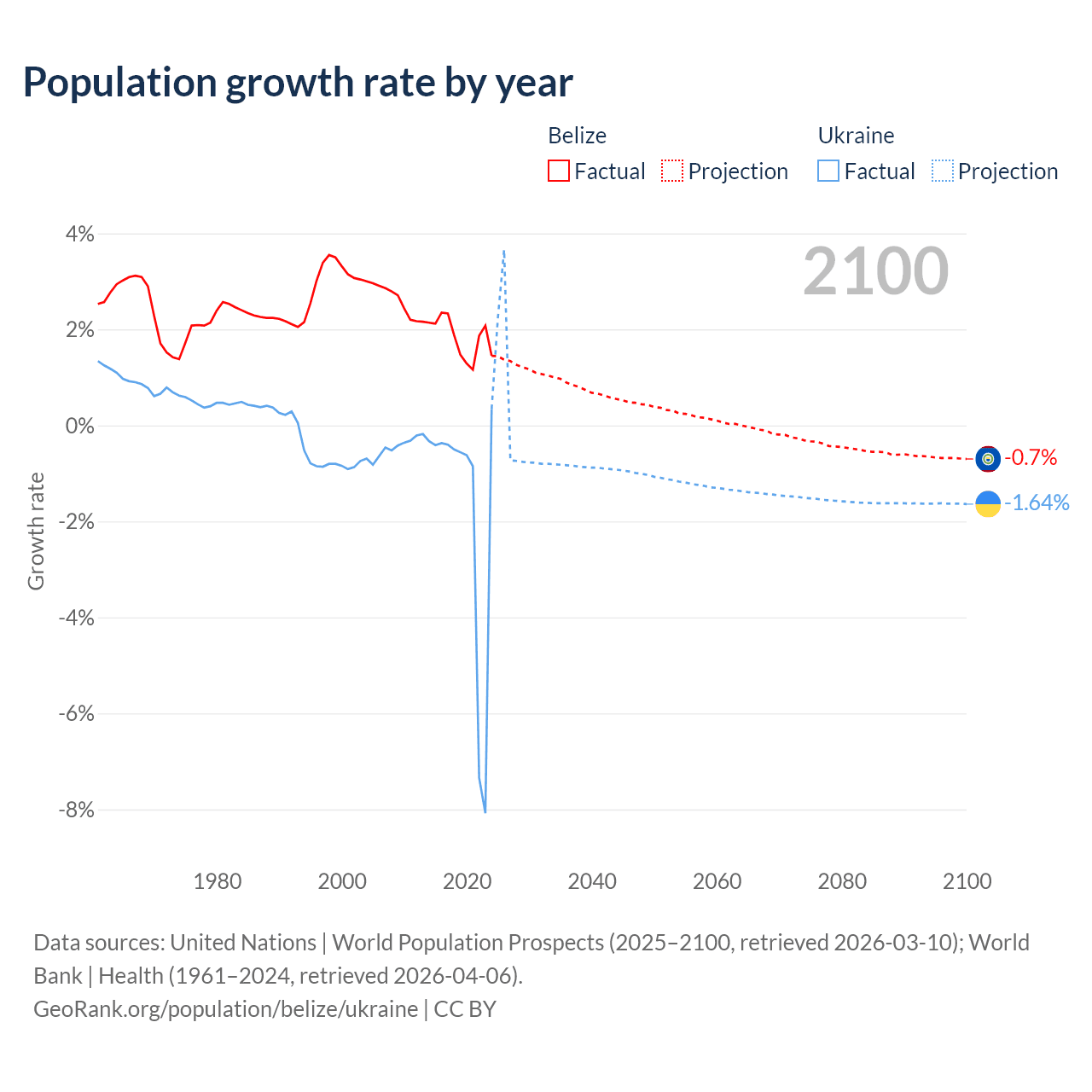 - For the last 10 years, Belize has had an average growth rate of +1.83% per year vs -1.74% in Ukraine.